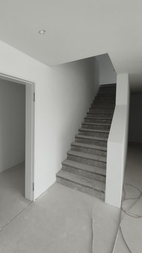 Im Anschluss konnte der Anhydrit-Unterlagsboden eingegossen werden und somit wurde die Basis für den weiteren Innenausbau gelegt. Aktuell werden die Innenwände vom Gipser abgerieben.