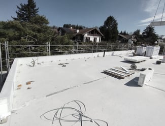 Die Dachkranzelemente sind montiert und schliessen den Rohbau von oben ab. Im Innern haben die Installateure bereits mit den Rohbauinstallationen begonnen.