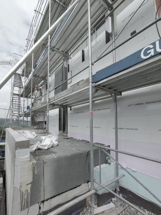 Aktuell ist der Fassadenbauer am Werk und hüllt das Gebäude mit Dämmplatten ein.