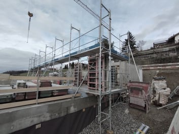 Mittlerweile sind alle Betonwände betoniert oder zumindest für das Betonieren vorbereitet. Im vorderen Bereich ist das Gerüst für die Arbeitssicherung errichtet worden.