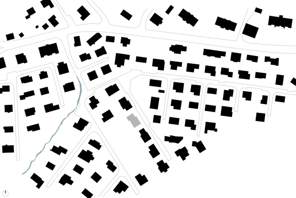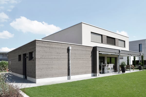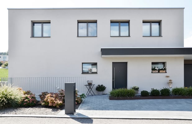 Der schlichte Baukörper teilt sich in zwei Kuben, welche sich auch in der Materialisierung unterscheiden. Das Vordach verbindet die beiden Kuben miteinander und lässt sie als