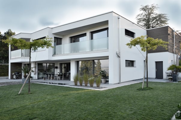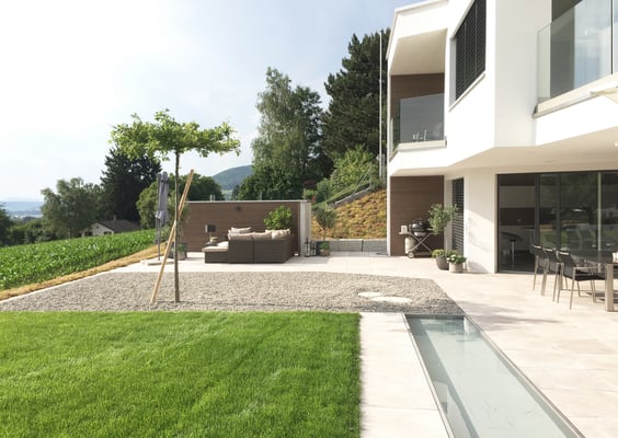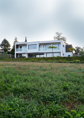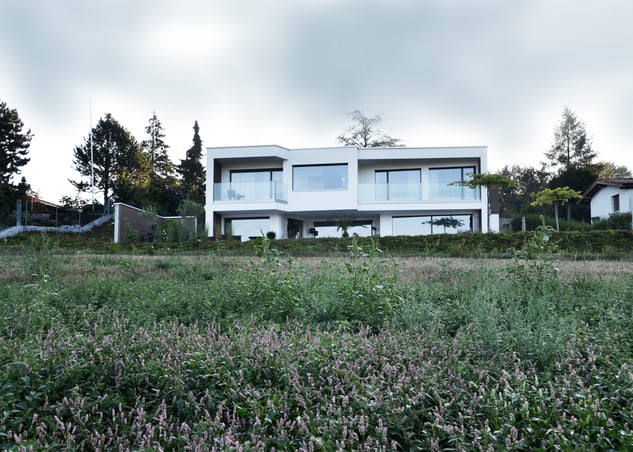 Das Grundstück befindet sich ausserhalb von Reinach AG, leicht erhöht mit direktem Blick ins Grüne. Die zurückgestaffelte Fassade ermöglicht verschiedene Blickwinkel in die naturnahe Umgebung. Die leichte Bewegung in der Fassade gibt der schlichten Kubatur ihren eigenen Charakter und lässt sie in seine Umgebung einflechten.