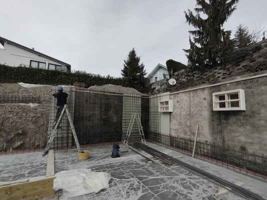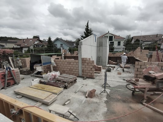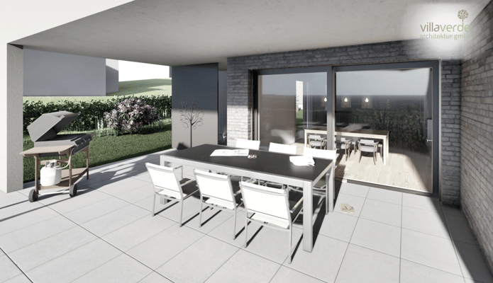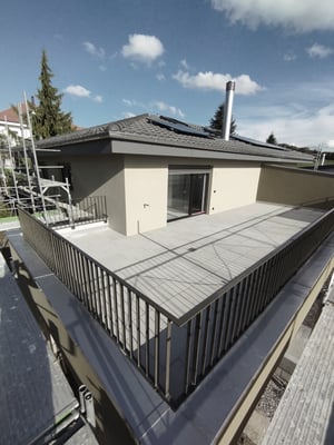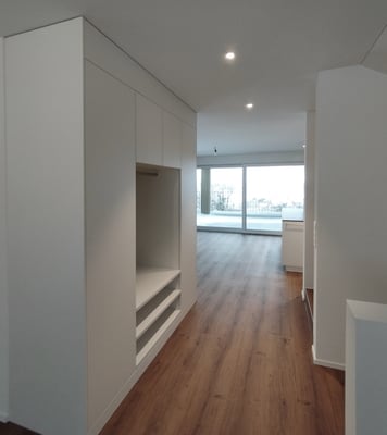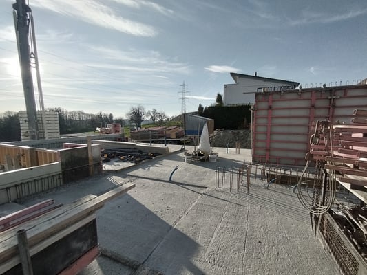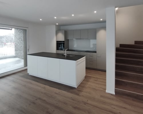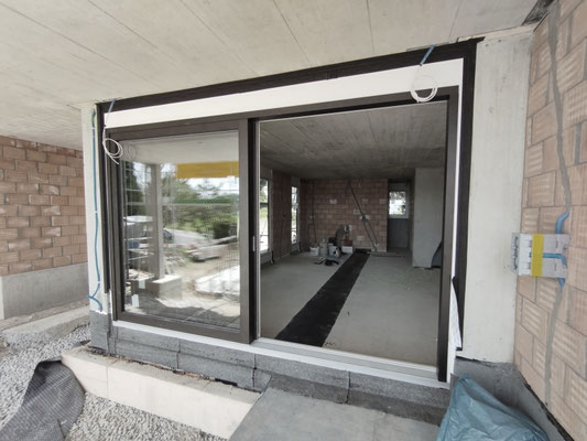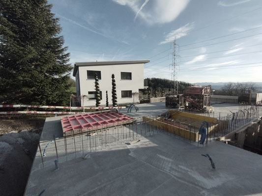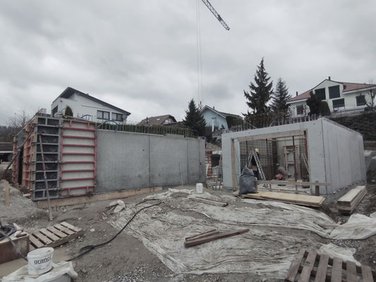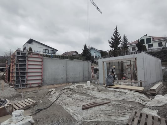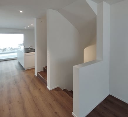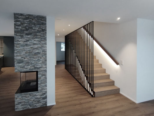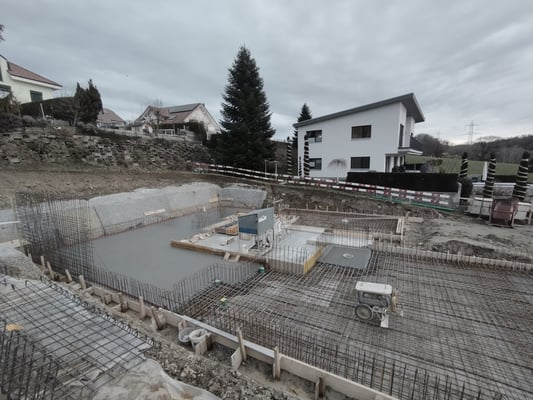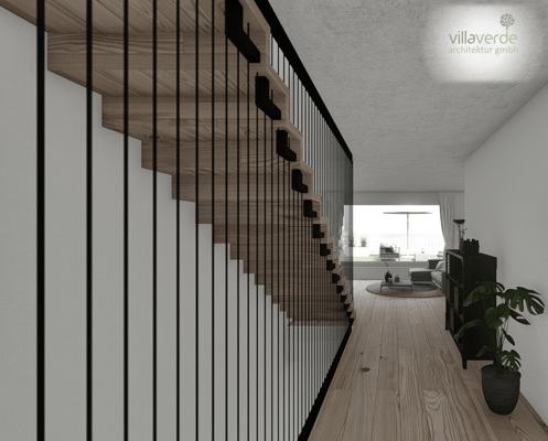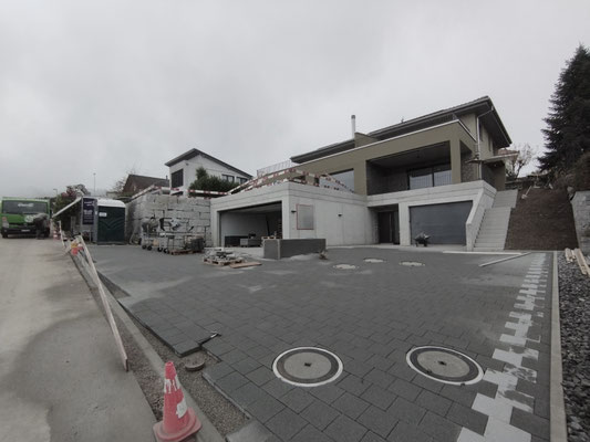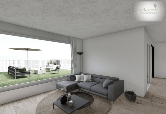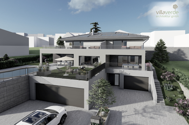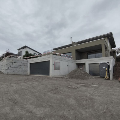 Das Gebäude besteht aus einer Haupt- und Einliegerwohnung. Die Hauptwohnung mit einer praktischen Raumaufteilung, grosser Terrasse mit Pool im Parterre und grosszügiger Garage. Die Einliegerwohnung mit separatem Eingang und Garage, erstreckt sich über drei Geschosse und verfügt ebenfalls über Terrasse und Balkon. Die einfache und klare Kubatur der Hauptbaute, wird durch die vorspringenden, farblich abgehobenen Balkonteile unterbrochen. Das Grundstück liegt unmittelbar am Dorfrand, dies ermöglicht einen umfassenden Blick durch das Panoramafenster in die Natur.