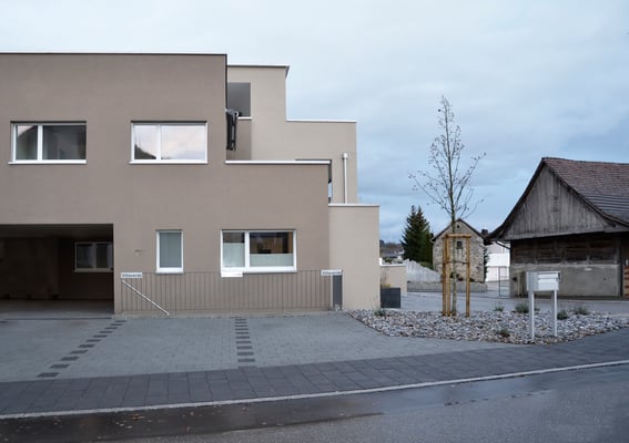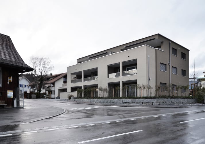 Mitten im Dorfkern von Schlierbach befindet sich das neue Mehrfamilienhaus. Die schlichte, kubische Form des Gebäudes wird durch die Balkonöffnungen strukturiert. Die Balkonschicht dient als Filterschicht zwischen dem Wohnzimmer und der Dorfstrasse. Der braune Verputz nimmt Bezug auf die Scheune, welche sich im Süden des Gebäudes befindet.